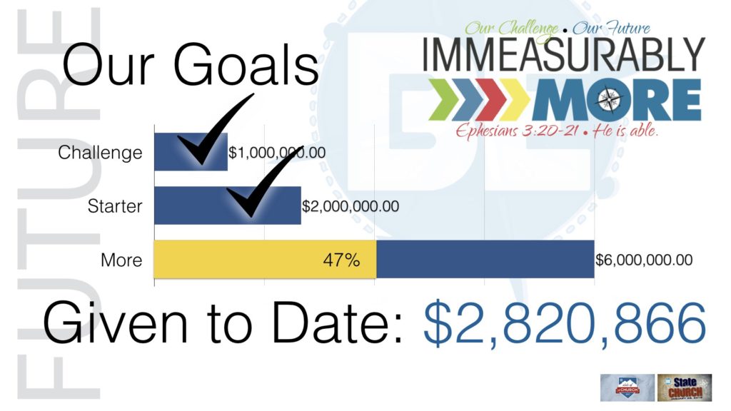 In the middle of starting new ministries and the growth of our small groups and D28 groups, we know that 2018 will be an exciting year for our Immeasurably More campaign, as the land begins to be prepped for construction. We anticipate seeing that begin in early fall.